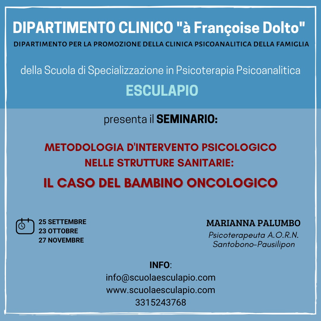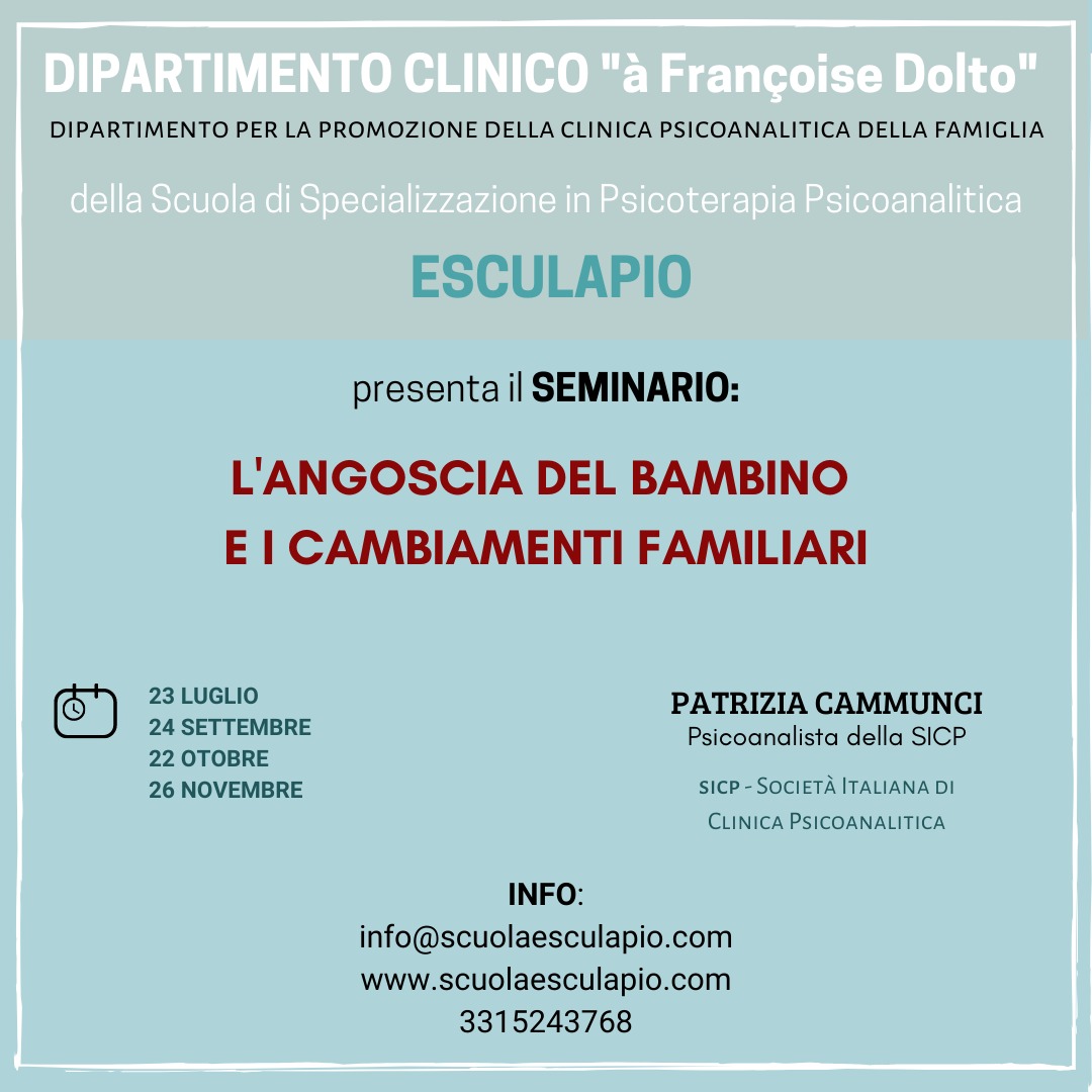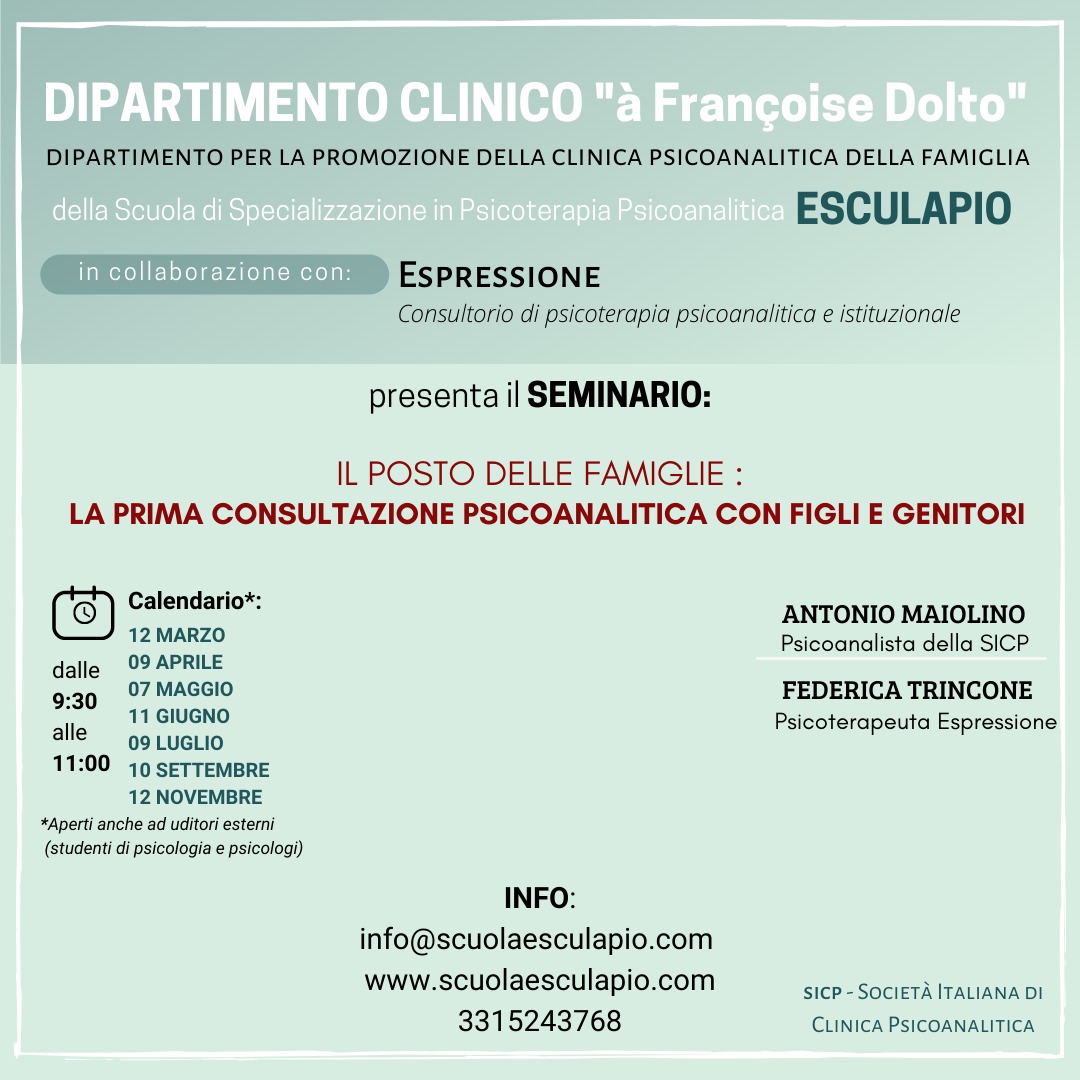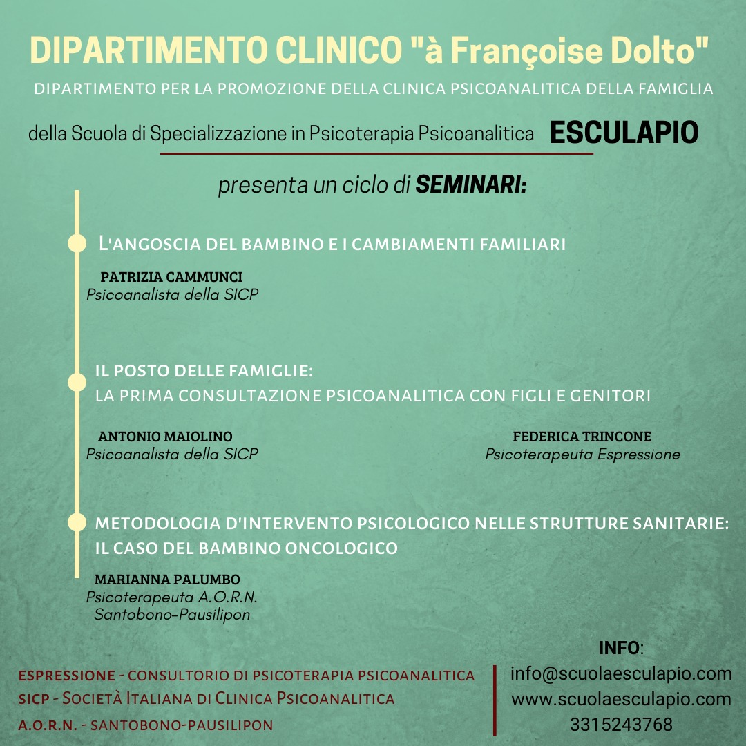 Il Dipartimento è una sezione di ESCULAPIO, Scuola di Specializzazione in Psicoterapia a Orientamento Psicoanalitico, rappresentandone il versante della formazione dal punto di vista teorico, attraverso l’organizzazione di un ciclo annuale di Seminari dedicati monograficamente a temi diversi d’ispirazione psicoanalitica.